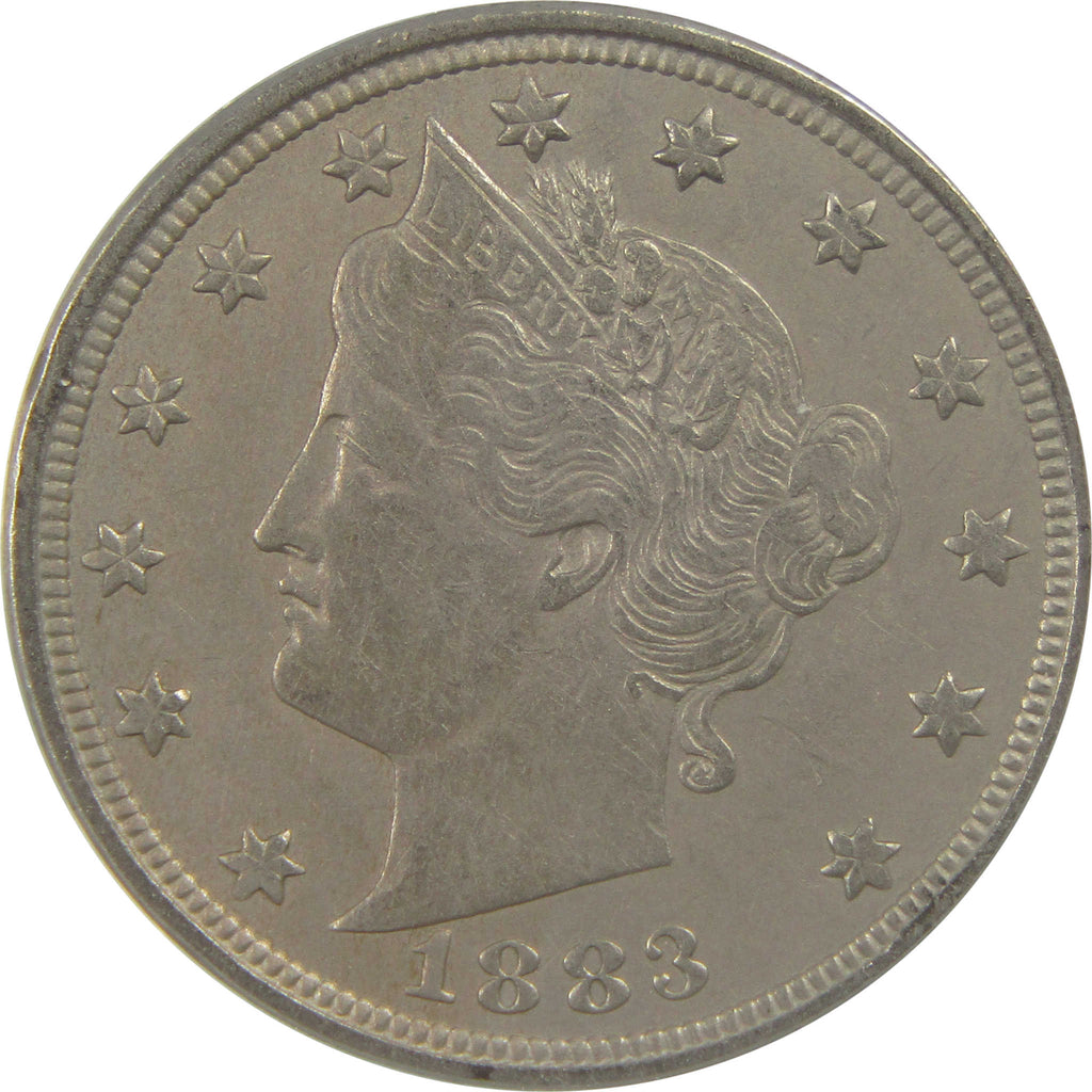 A genuine 1883 With Cents Liberty Head V Nickel Coin, graded and certified AU 50 Details by ANACS. Cleaned