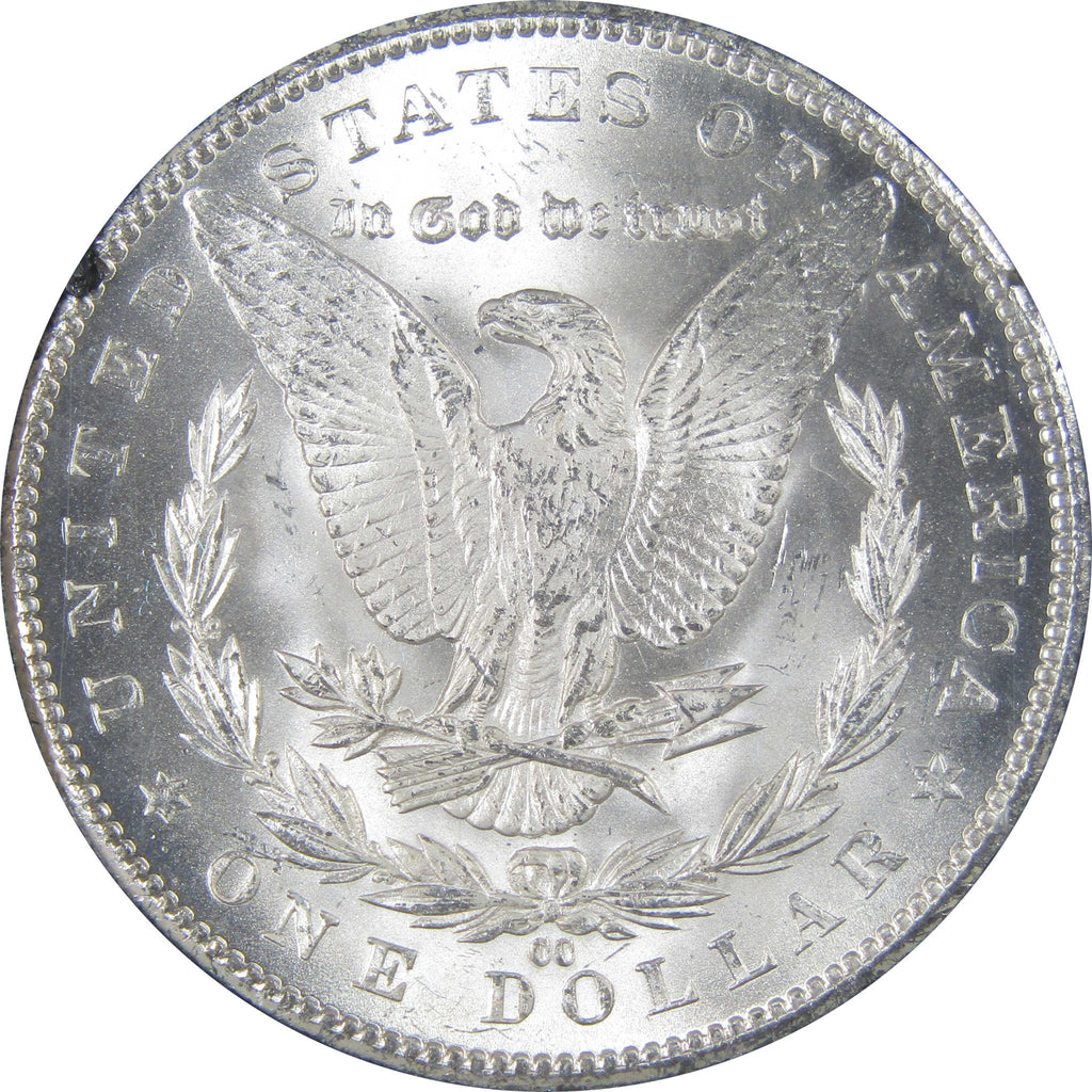 This large 90% silver Morgan dollar bears George T. Morgan's classic depiction of Liberty facing left in a Phrygian cap and a spray of leaves held by a ribbon inscribed LIBERTY. The reverse features an eagle clutching a branch and three arrows.
