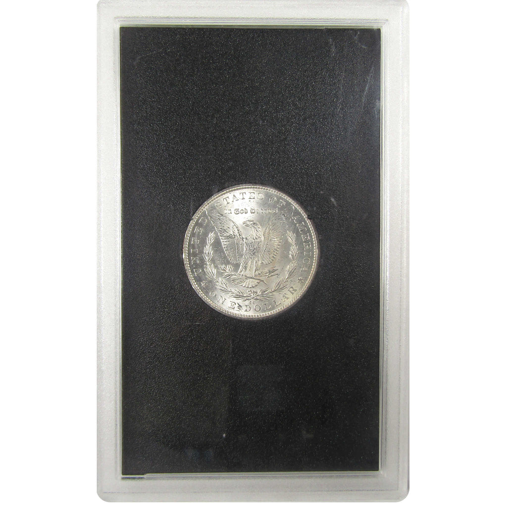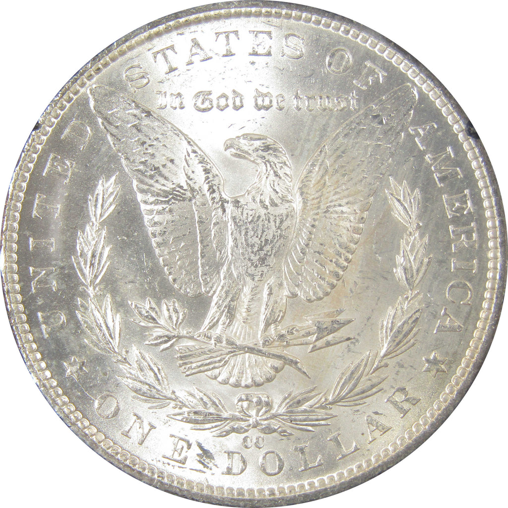 This large 90% silver Morgan dollar bears George T. Morgan's classic depiction of Liberty facing left in a Phrygian cap and a spray of leaves held by a ribbon inscribed LIBERTY. The reverse features an eagle clutching a branch and three arrows.