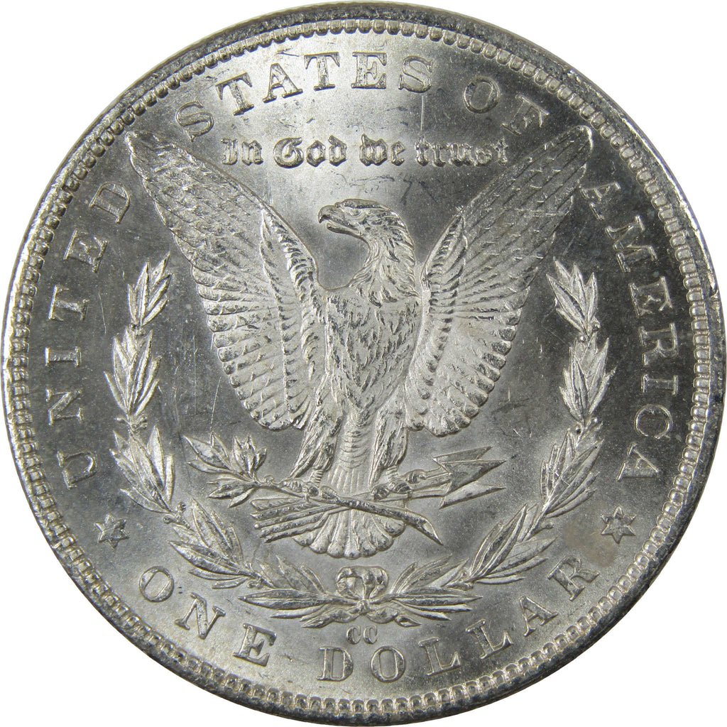 This large 90% silver Morgan dollar bears George T. Morgan's classic depiction of Liberty facing left in a Phrygian cap and a spray of leaves held by a ribbon inscribed LIBERTY. The reverse features an eagle clutching a branch and three arrows.