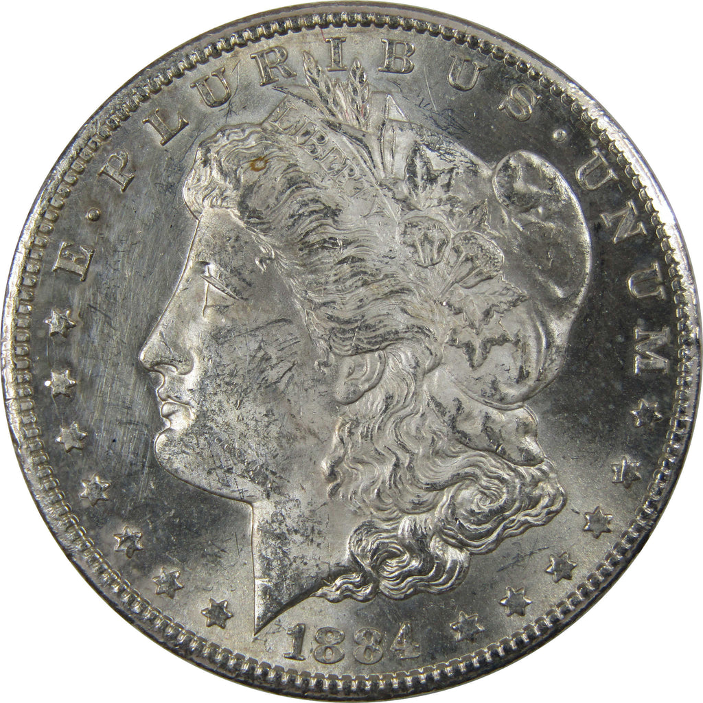 A genuine 1884 CC Morgan Silver Dollar Coin, in Uncirculated Details Condition. Contains 90% Silver. Obverse Cleaned, Scratched