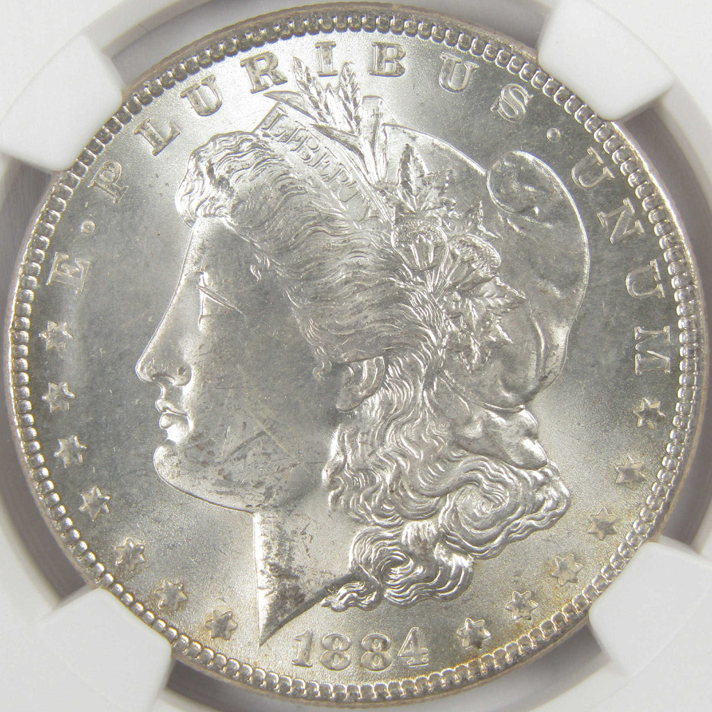 A genuine 1884 Morgan Silver Dollar Coin, graded and certified MS 63 by NGC. Contains 90% Silver