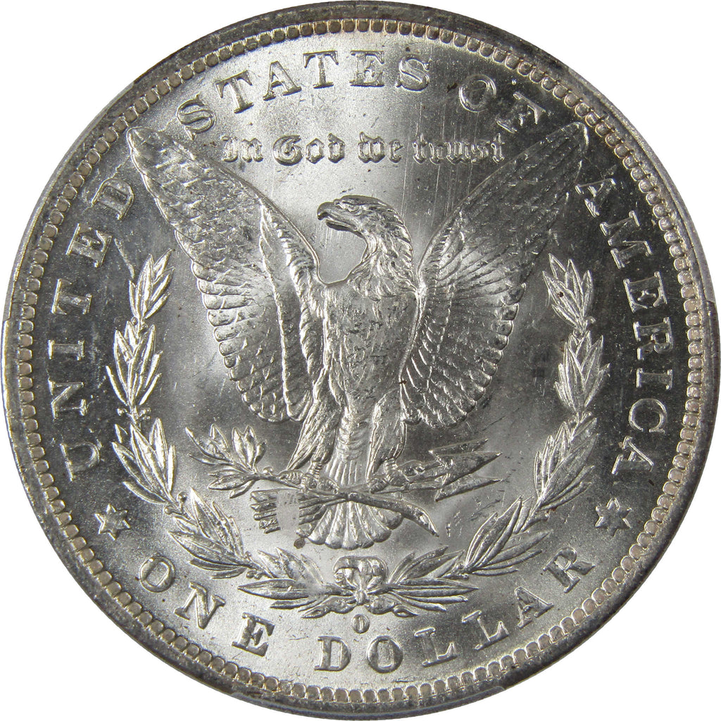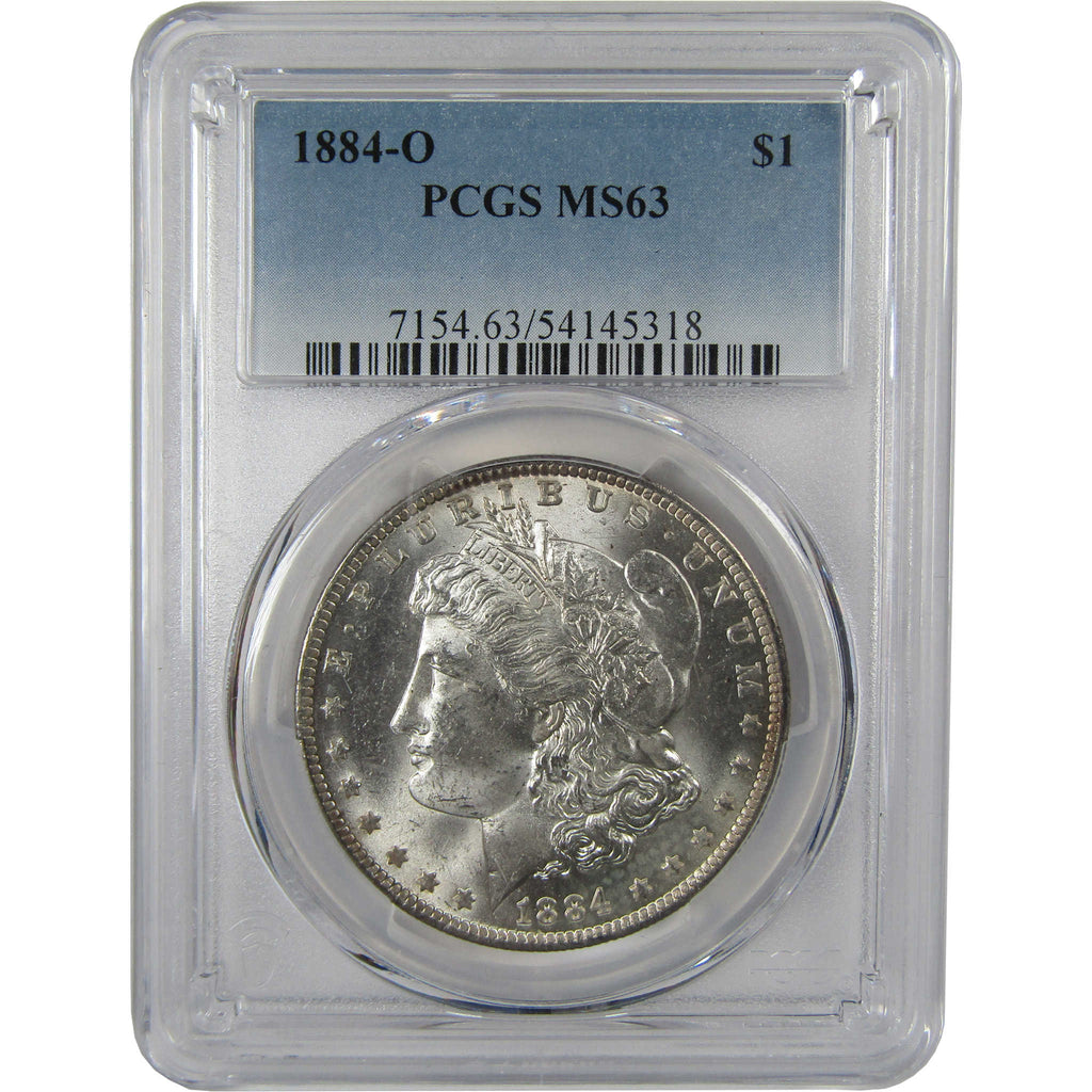 A genuine 1884 O Morgan Silver Dollar Coin, graded and certified MS 63 by PCGS. Contains 90% Silver