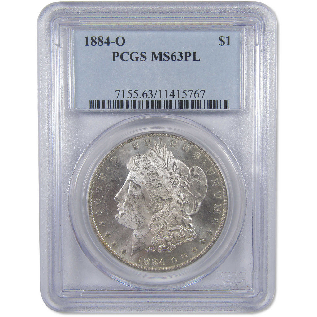 A genuine 1884 O Morgan Silver Dollar Proof-Like Coin, graded and certified MS 63 PL by PCGS. Contains 90% Silver