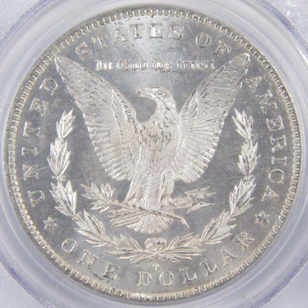 This large 90% silver Morgan dollar bears George T. Morgan's classic depiction of Liberty facing left in a Phrygian cap and a spray of leaves held by a ribbon inscribed LIBERTY. The reverse features an eagle clutching a branch and three arrows.