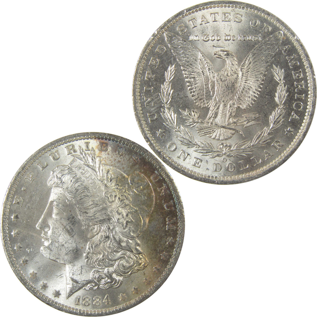 A genuine 1884 O Morgan Silver Dollar Coin, in Uncirculated Mint State Condition. Contains 90% Silver. Toned Obverse