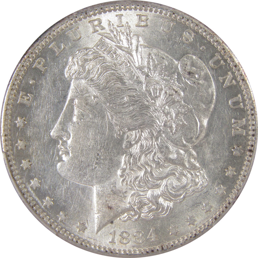 A genuine 1884 S Morgan Silver Dollar Coin, graded and certified AU 55 by PCGS. Contains 90% Silver