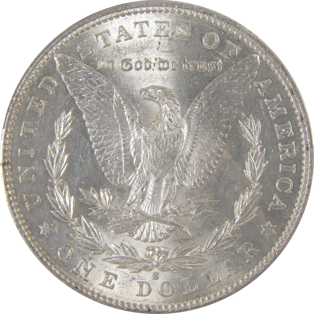 This large 90% silver Morgan dollar bears George T. Morgan's classic depiction of Liberty facing left in a Phrygian cap and a spray of leaves held by a ribbon inscribed LIBERTY. The reverse features an eagle clutching a branch and three arrows.