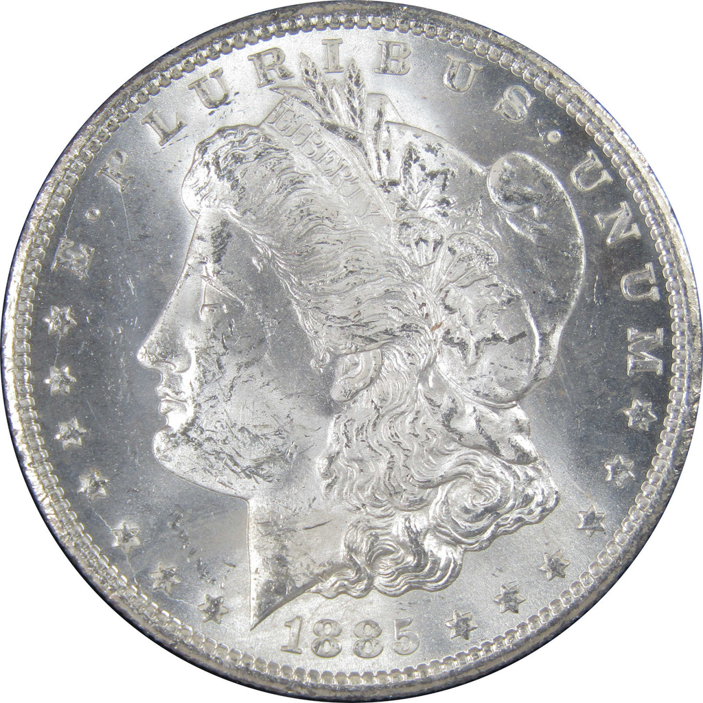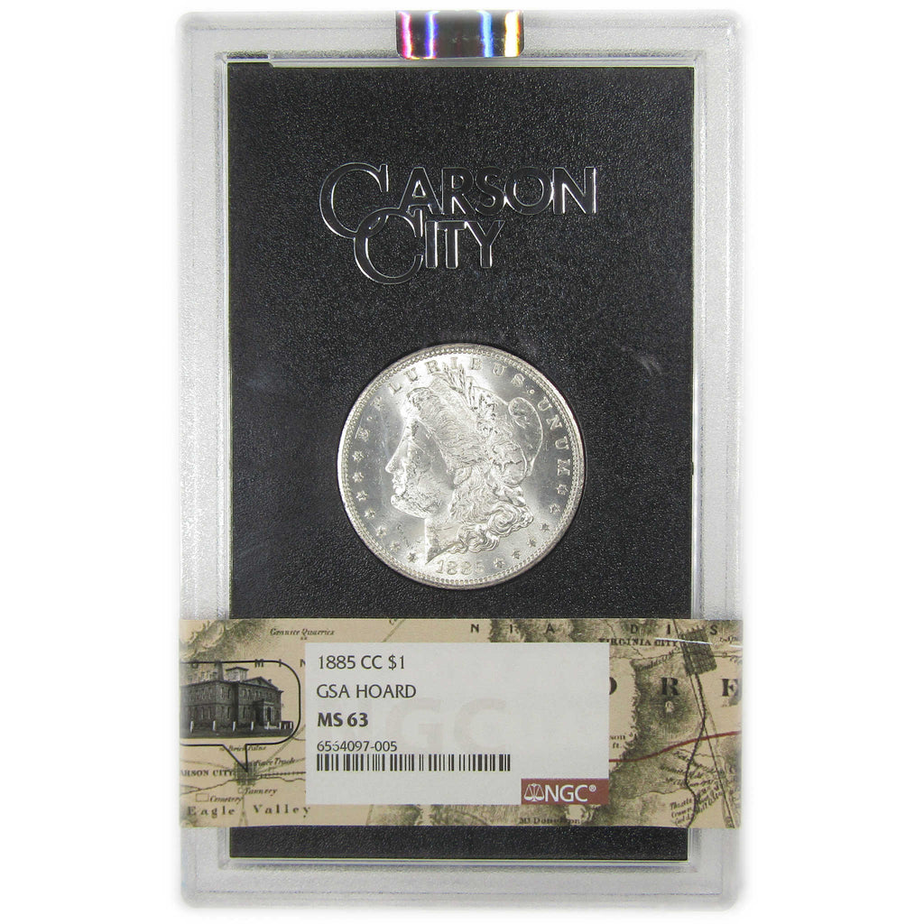 A genuine 1885 CC GSA Morgan Silver Dollar Coin, graded and certified MS 63 by NGC. Contains 90% Silver. Comes with the original General Services Administration (GSA) holder, but does not include the box or insert