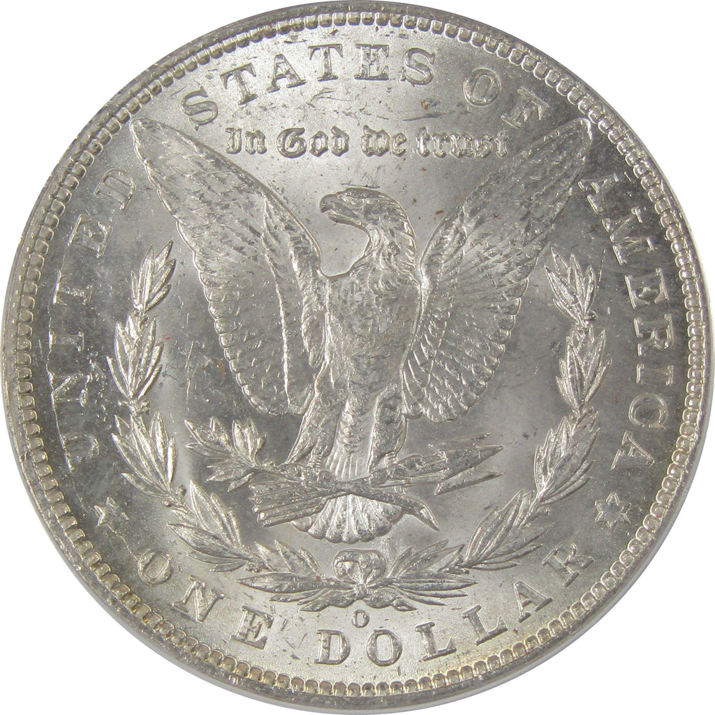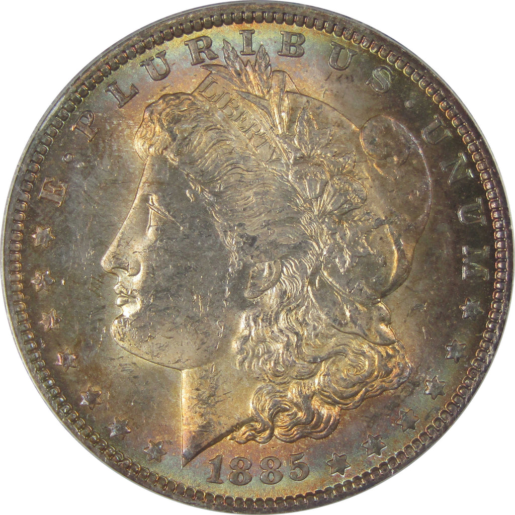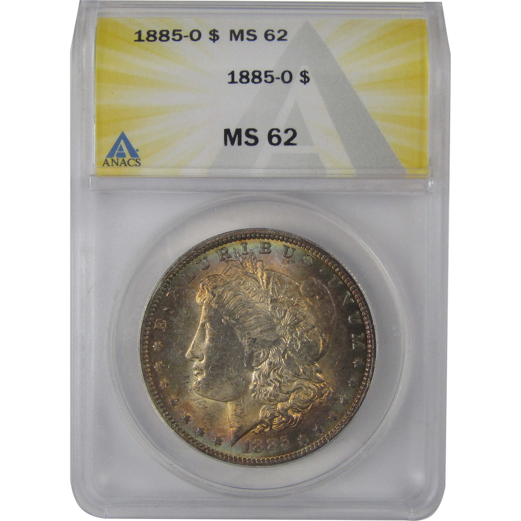 A genuine 1885 O Morgan Silver Dollar Coin, graded and certified MS 62 by ANACS. Contains 90% Silver. Toned Obverse