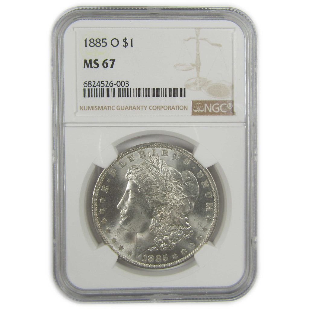 A genuine 1885 O Morgan Silver Dollar Coin, graded and certified MS 67 by NGC. Contains 90% Silver