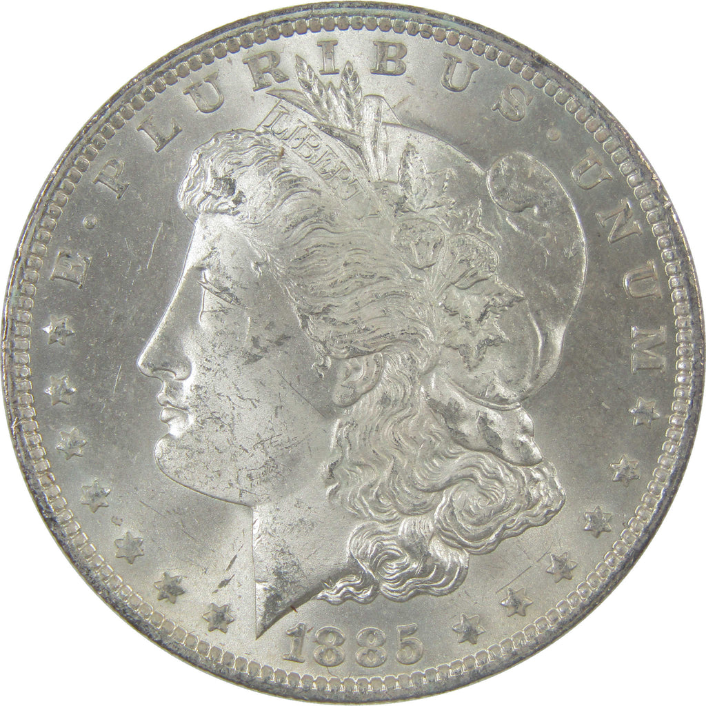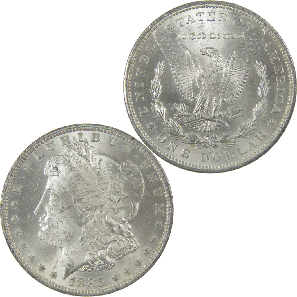 A genuine 1885 O Morgan Silver Dollar Coin, in BU Gem Uncirculated Mint State Condition. Contains 90% Silver
