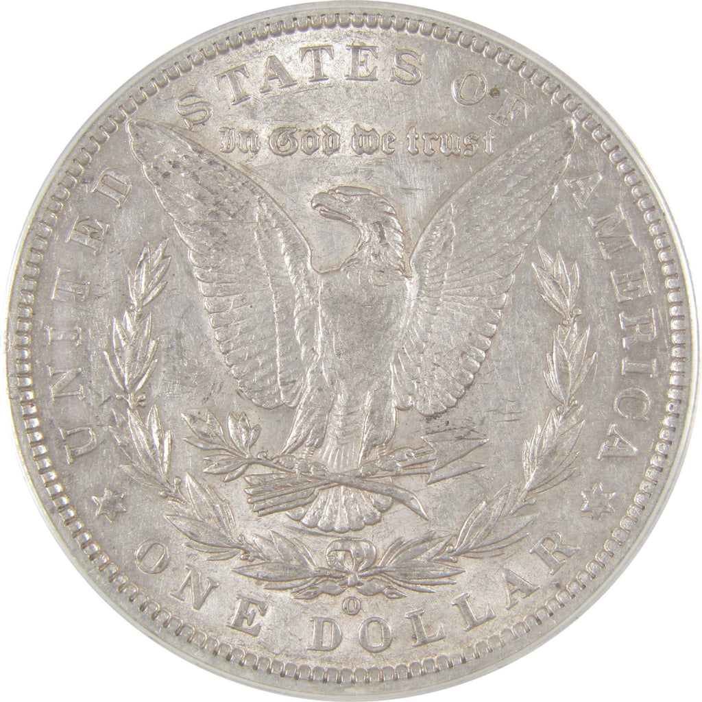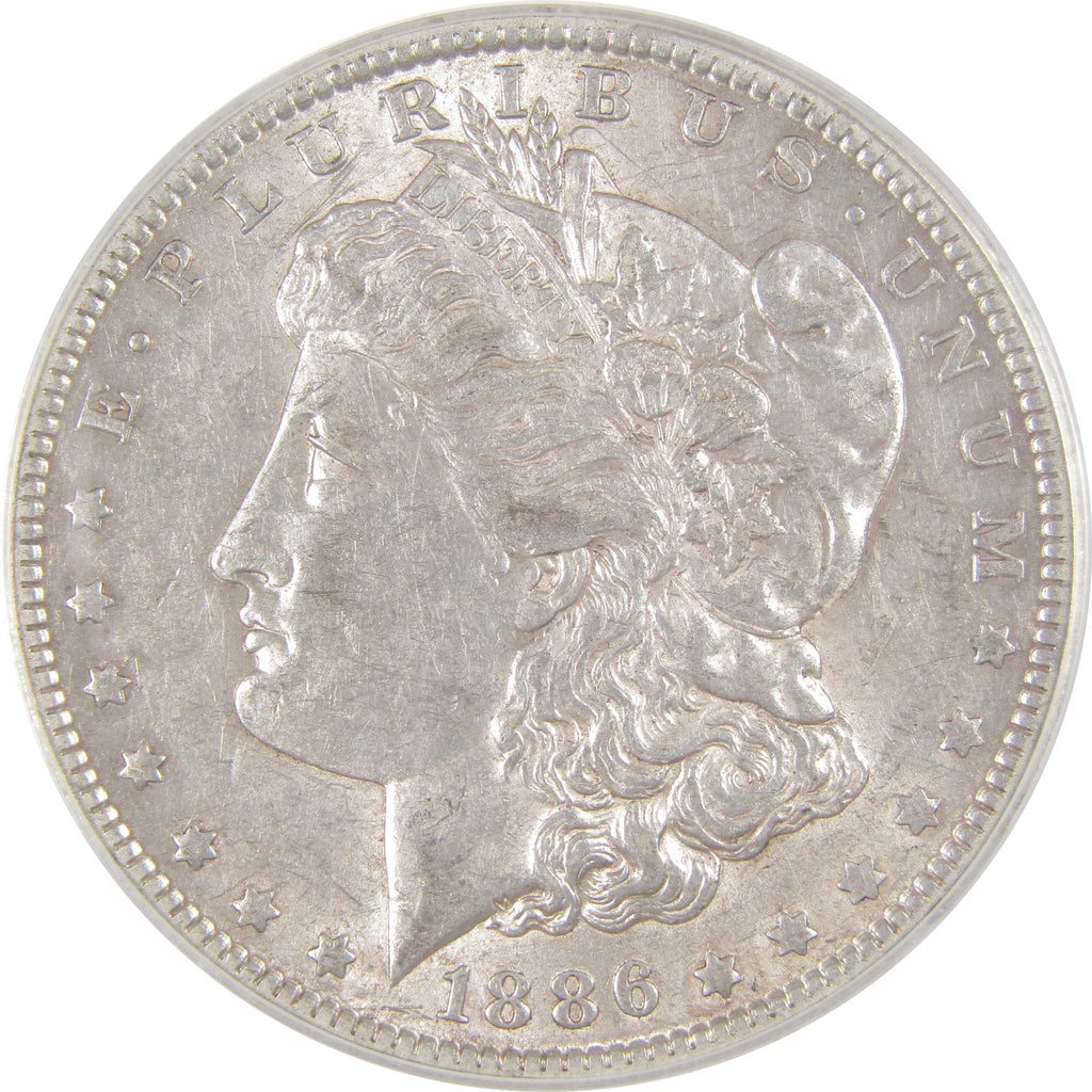 A genuine 1886 O Morgan Silver Dollar Coin, graded and certified AU 50 by ANACS. Contains 90% Silver
