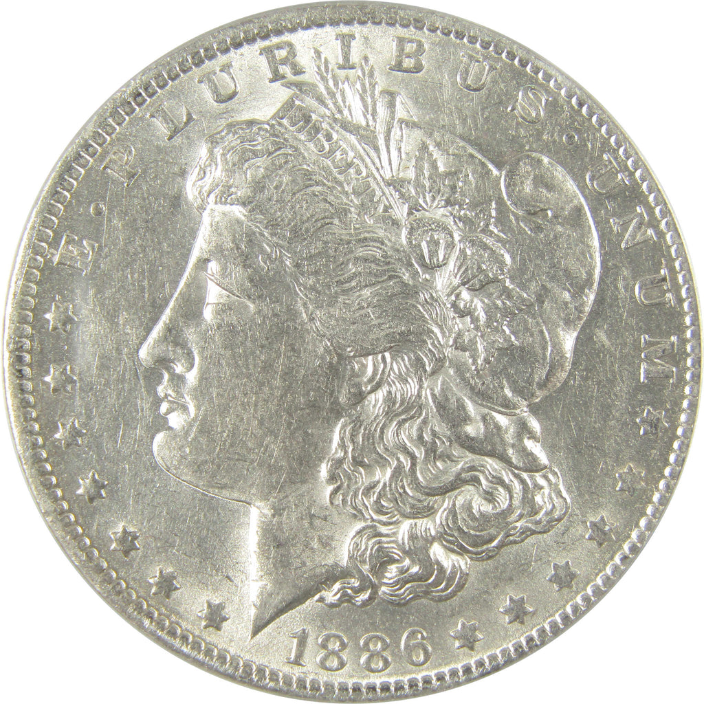 A genuine 1886 O Morgan Silver Dollar Coin, graded and certified AU 55 by ANACS. Contains 90% Silver