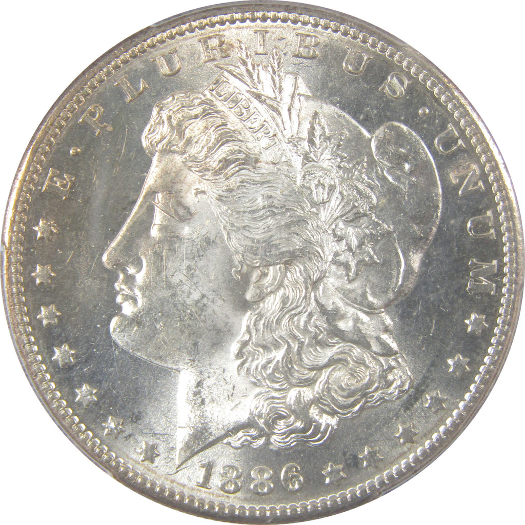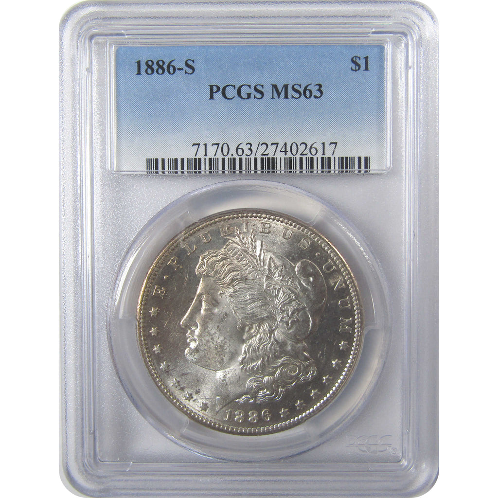 A genuine 1886 S Morgan Silver Dollar Coin, graded and certified MS 63 by PCGS. Contains 90% Silver