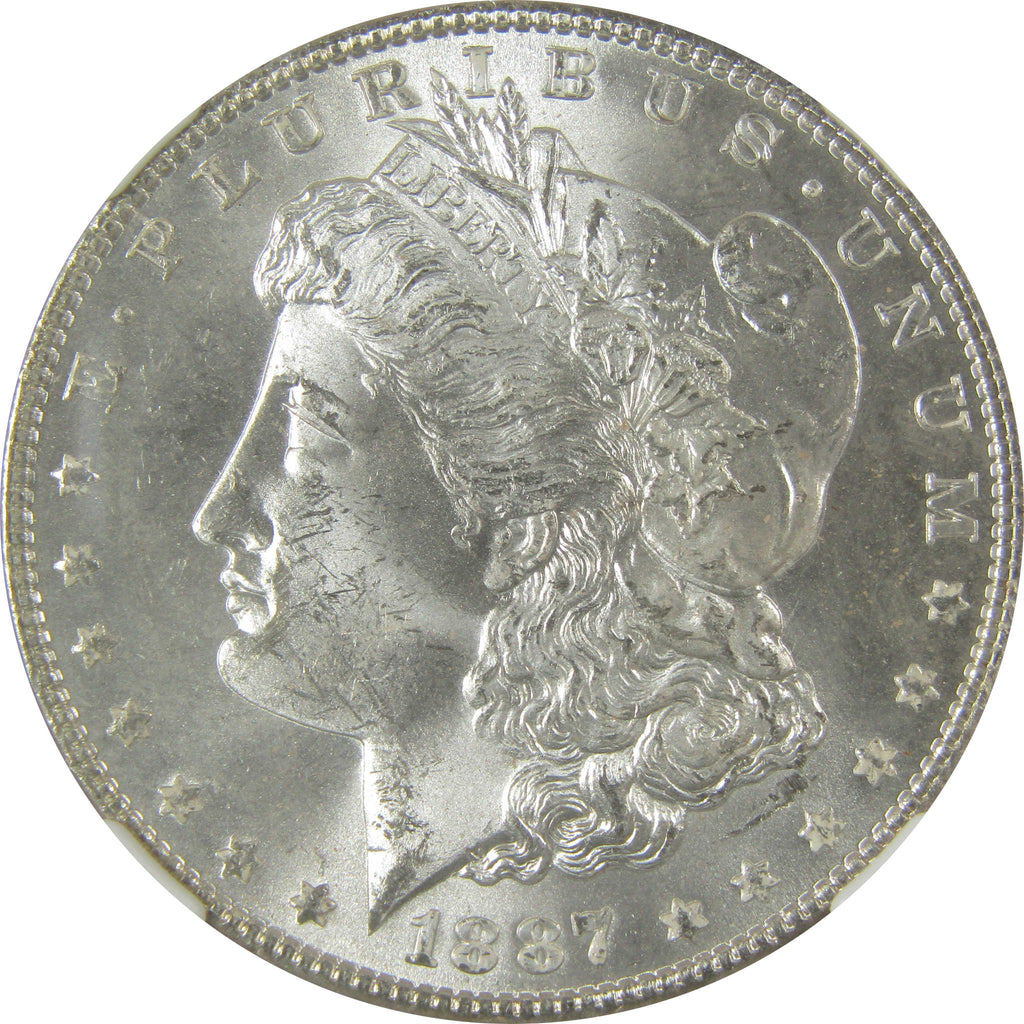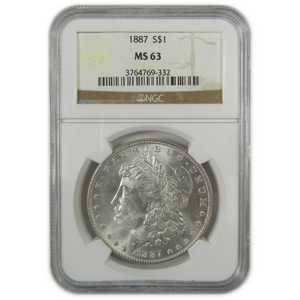 A genuine 1887 Morgan Silver Dollar Coin, graded and certified MS 63 by NGC. Contains 90% Silver