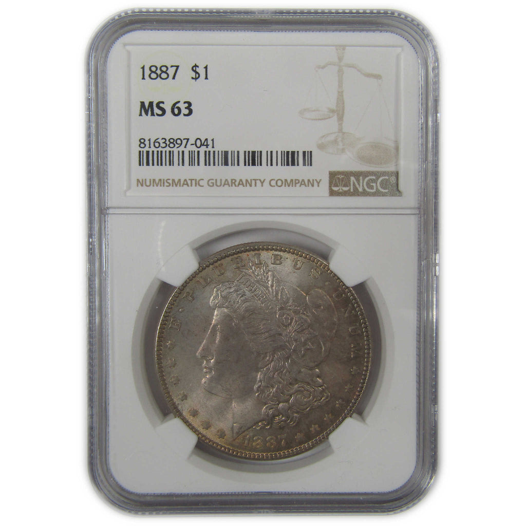 A genuine 1887 Morgan Silver Dollar Coin, graded and certified MS 63 by NGC. Contains 90% Silver