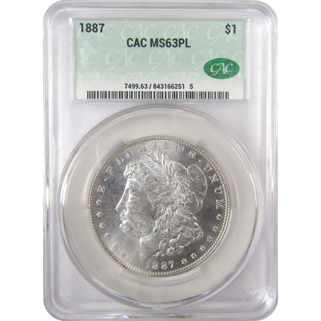 A genuine 1887 Morgan Silver Dollar Proof-Like Coin, graded and certified MS 63 PL by CAC. Contains 90% Silver
