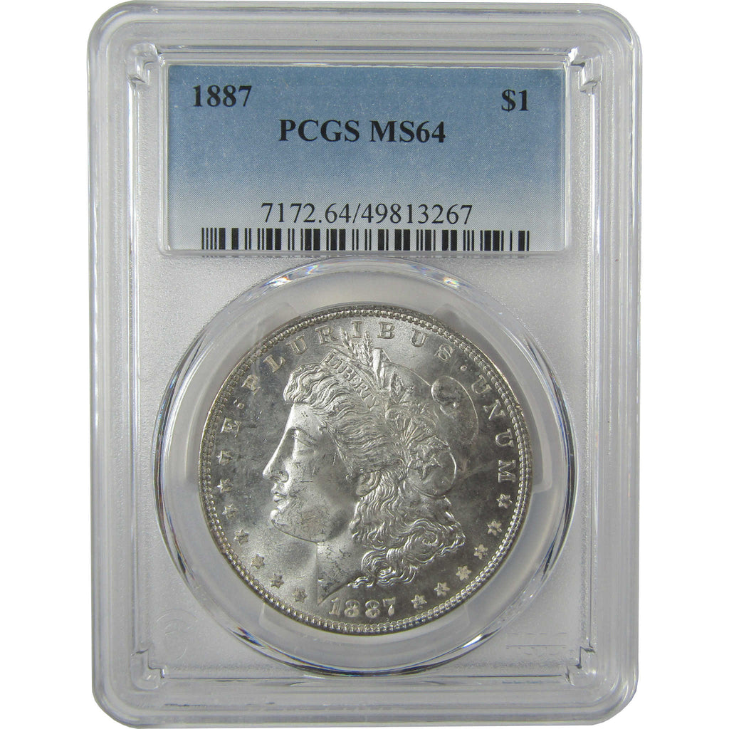 A genuine 1887 Morgan Silver Dollar Coin, graded and certified MS 64 by PCGS. Contains 90% Silver