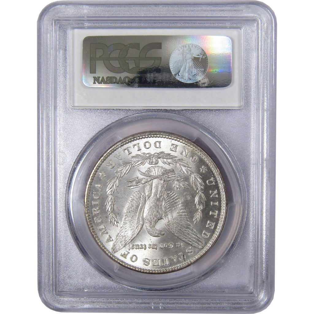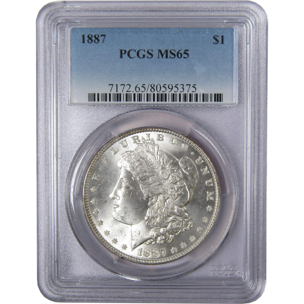 A genuine 1887 Morgan Silver Dollar Coin, graded and certified MS 65 by PCGS. Contains 90% Silver