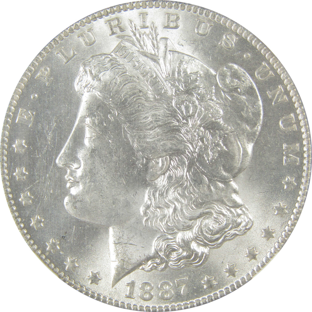 A genuine 1887 O Morgan Silver Dollar Coin, graded and certified MS 63 by NGC. Contains 90% Silver