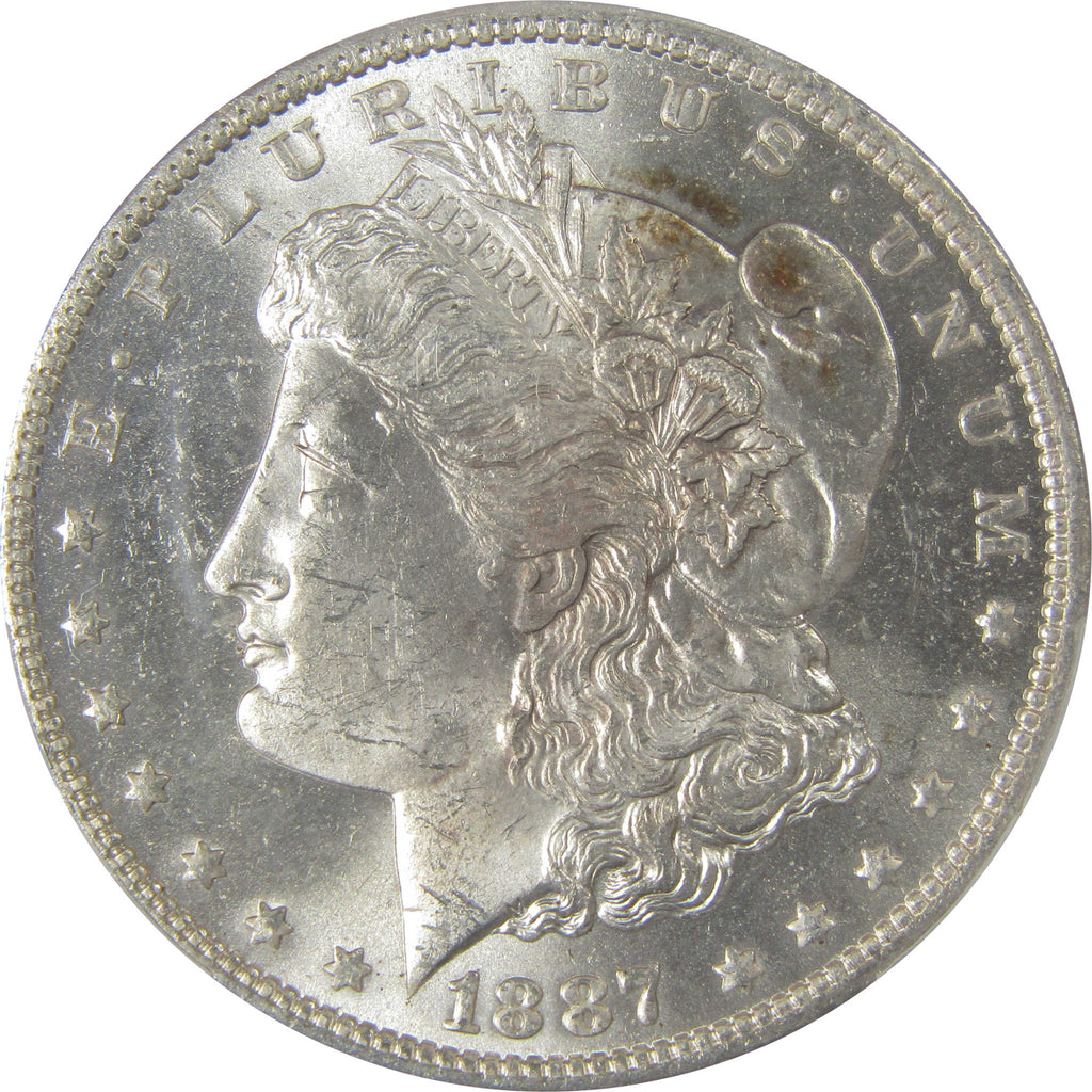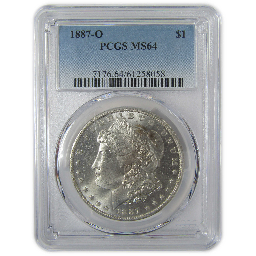 A genuine 1887 O Morgan Silver Dollar Coin, graded and certified MS 64 by PCGS. Contains 90% Silver