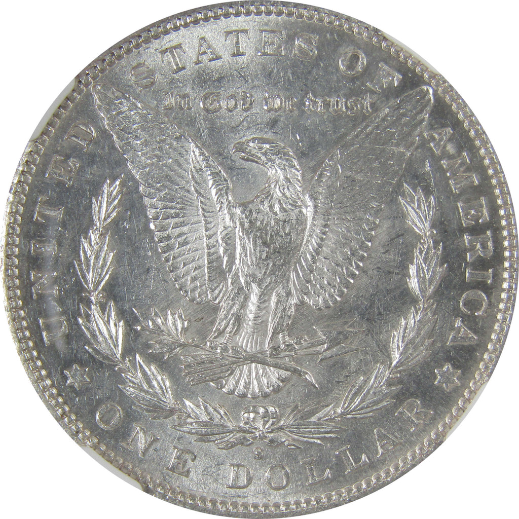 A genuine 1887 S Morgan Silver Dollar Coin, graded and certified MS 60 by NGC. Contains 90% Silver
