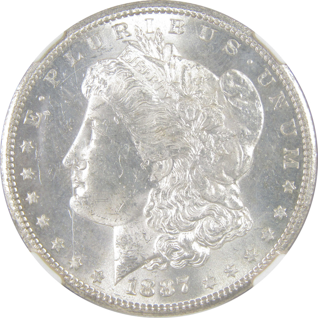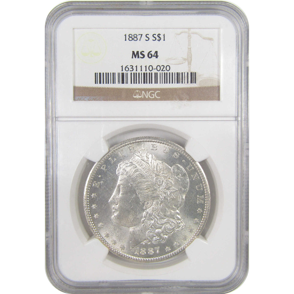 A genuine 1887 S Morgan Silver Dollar Coin, graded and certified MS 64 by NGC. Contains 90% Silver