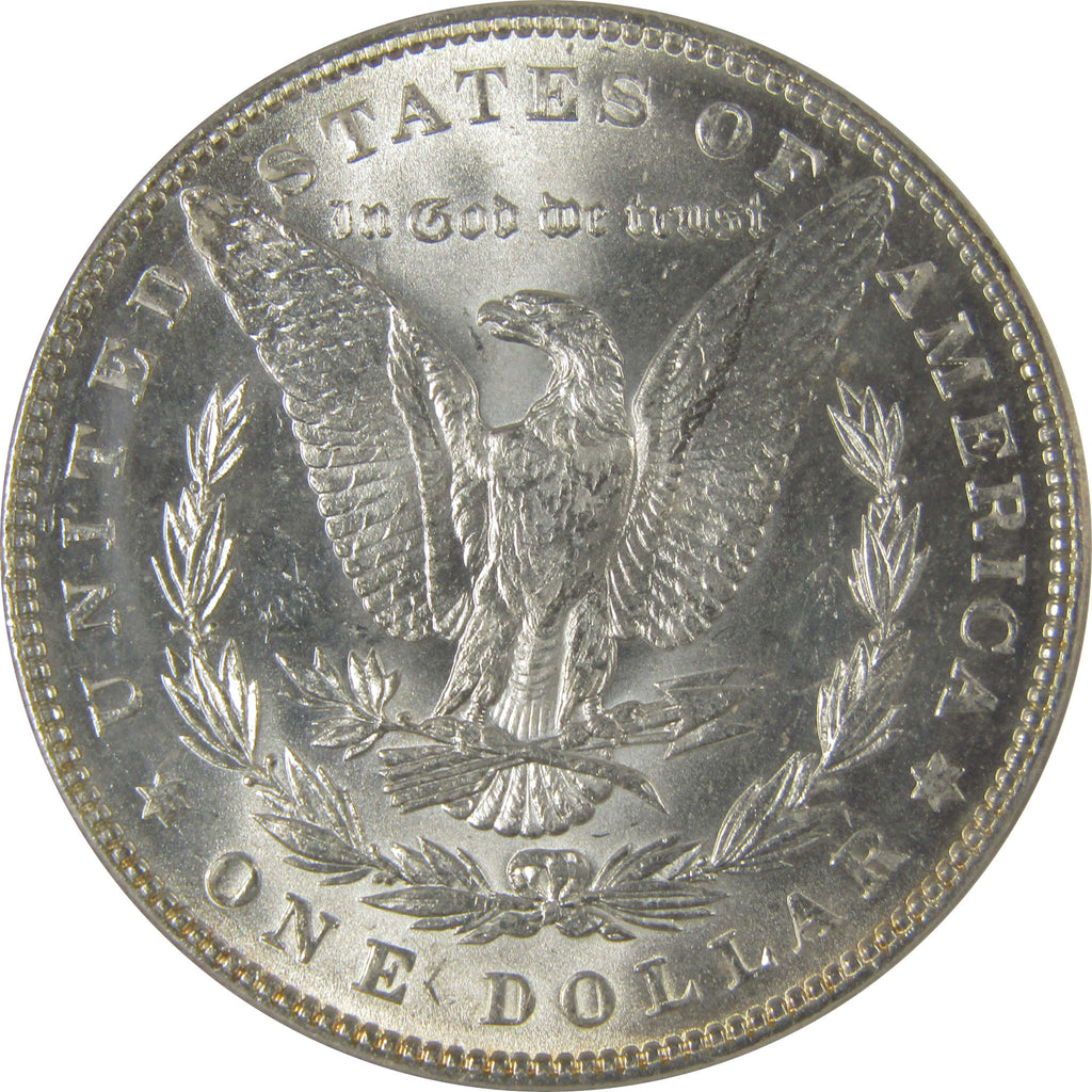 This large 90% silver Morgan dollar bears George T. Morgan's classic depiction of Liberty facing left in a Phrygian cap and a spray of leaves held by a ribbon inscribed LIBERTY. The reverse features an eagle clutching a branch and three arrows.