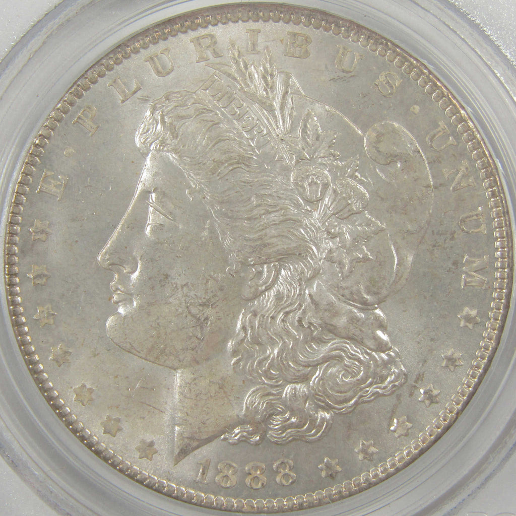 A genuine 1888 Morgan Silver Dollar Coin, graded and certified MS 63 by PCGS. Contains 90% Silver