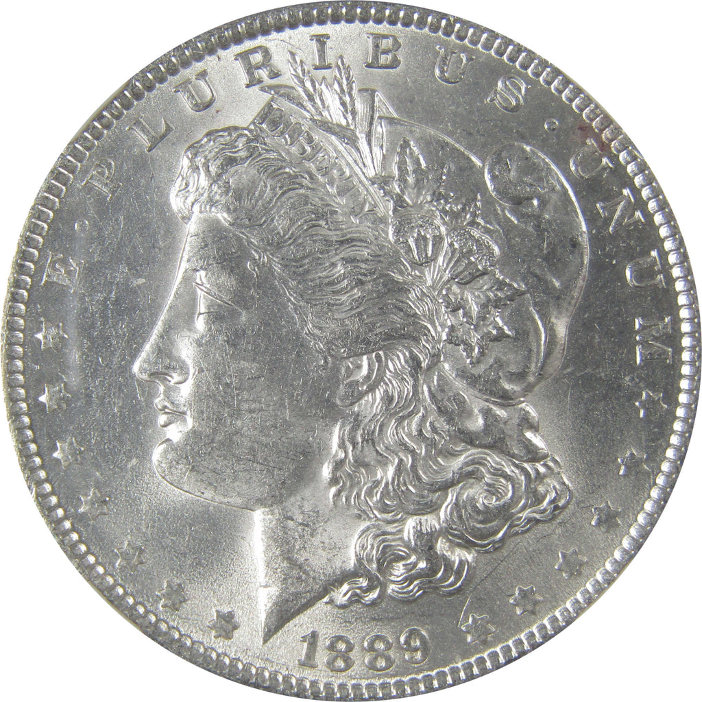 A genuine 1889 Morgan Silver Dollar Coin, graded and certified MS 61 by NGC. Contains 90% Silver