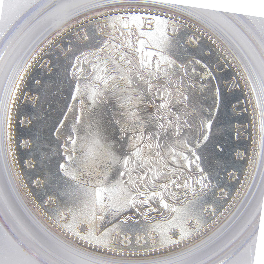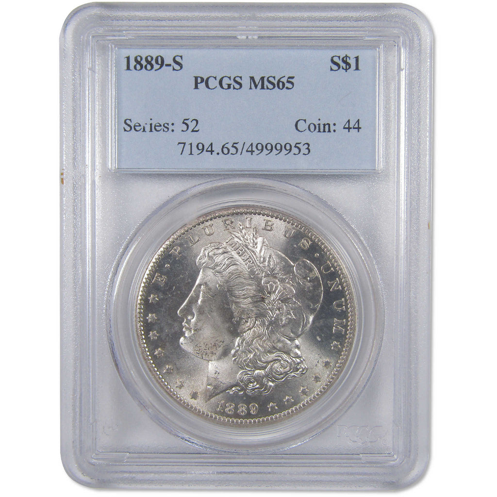 A genuine 1889 S Morgan Silver Dollar Coin, graded and certified MS 65 by PCGS. Contains 90% Silver