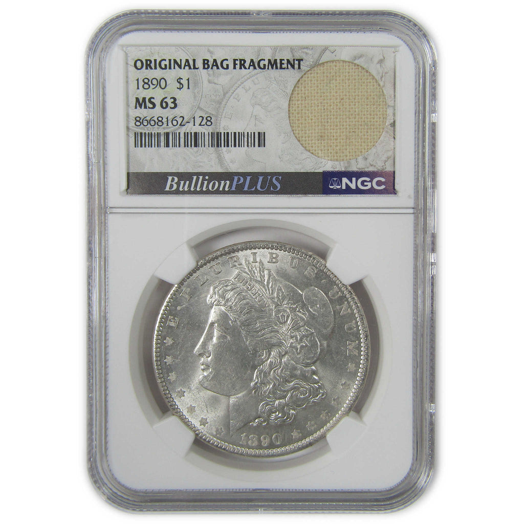 A genuine 1890 Morgan Silver Dollar Coin, graded and certified MS 63 by NGC. Contains 90% Silver. Comes with a fragment of an original vintage canvas bag embedded in the label
