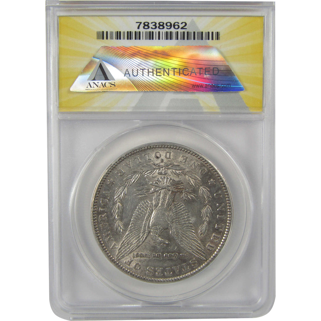 A genuine 1890 S Morgan Silver Dollar Coin, graded and certified AU 50 by ANACS. Contains 90% Silver