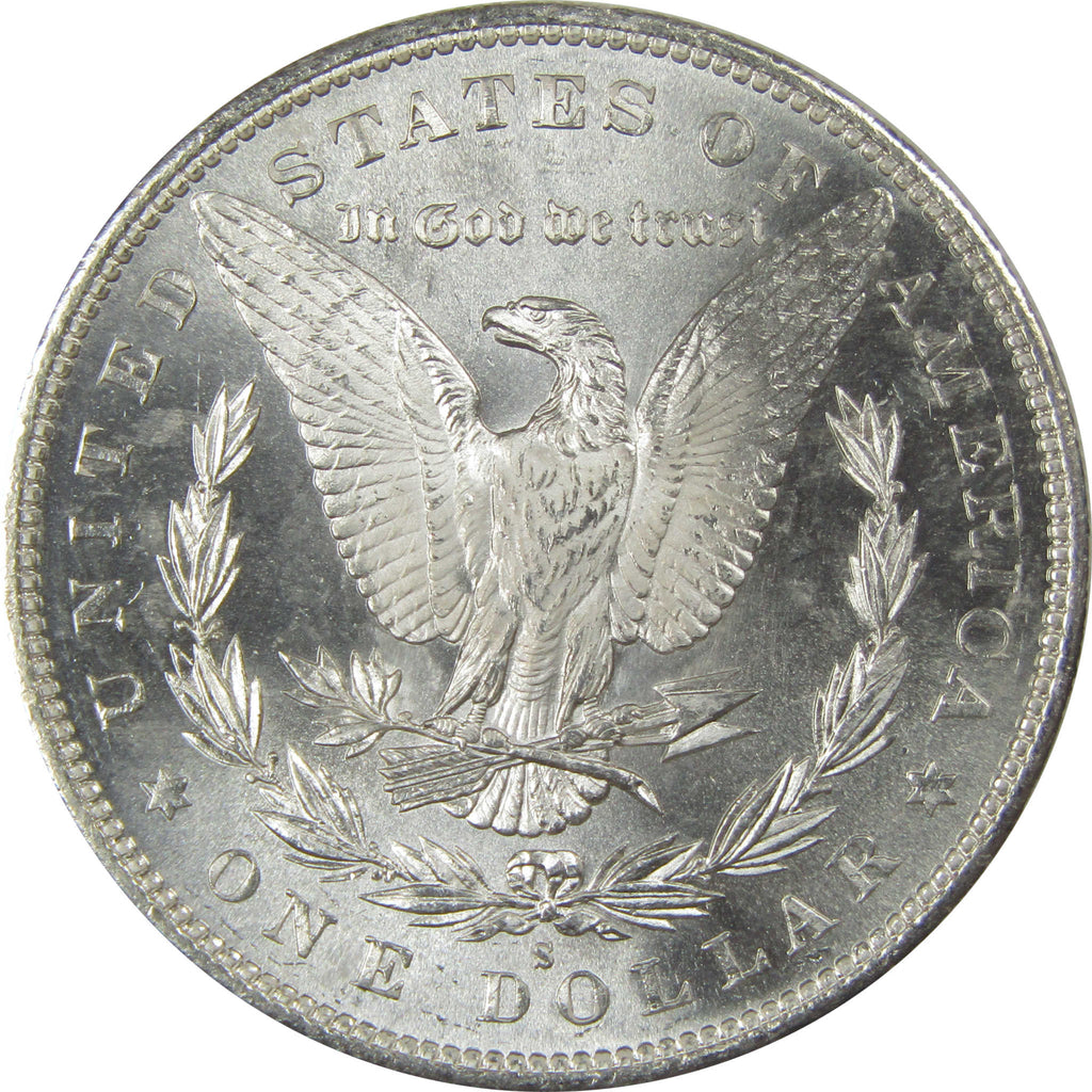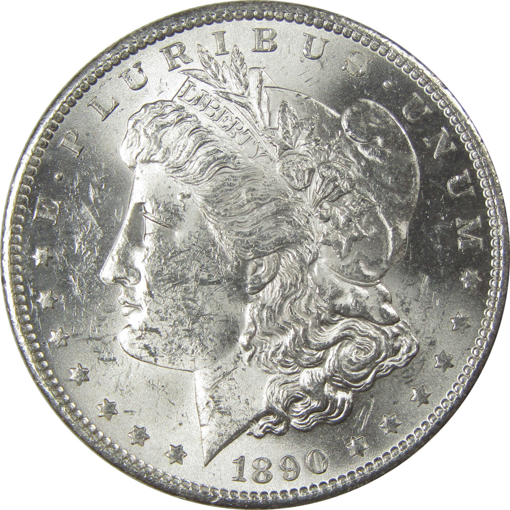 A genuine 1890 S Morgan Silver Dollar Coin, in Uncirculated Details Condition. Contains 90% Silver. Scratches