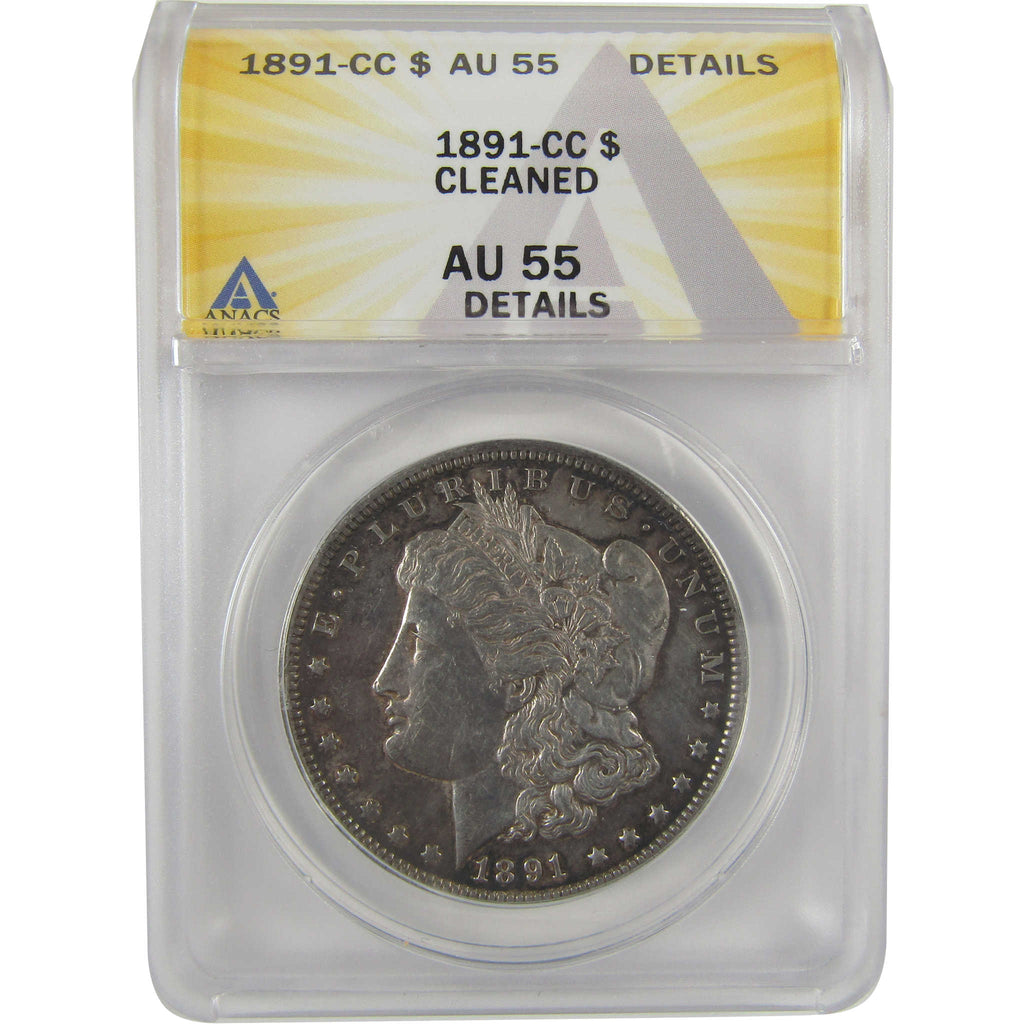 A genuine 1891 CC Morgan Silver Dollar Coin, graded and certified AU 55 Details by ANACS. Contains 90% Silver. Cleaned
