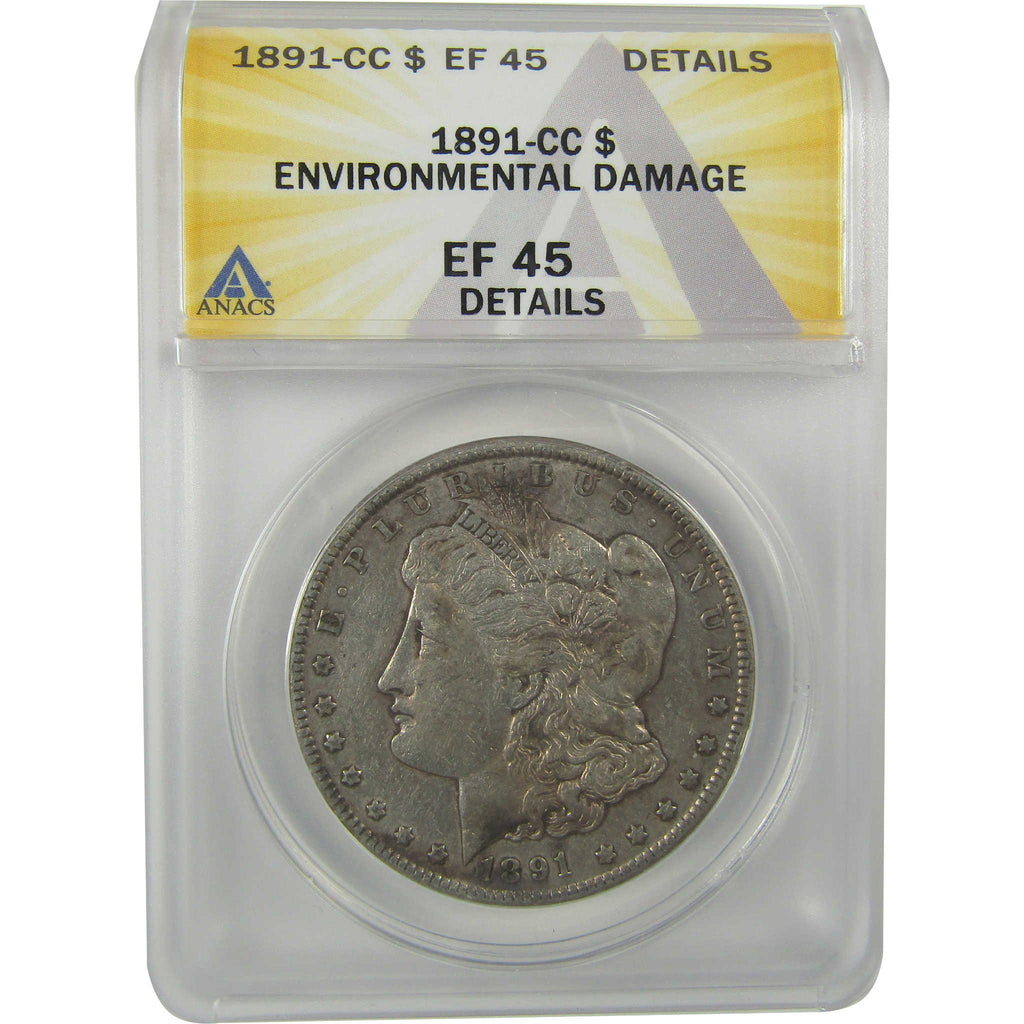 A genuine 1891 CC Morgan Silver Dollar Coin, graded and certified EF 45 Details by ANACS. Contains 90% Silver. Environmental Damage