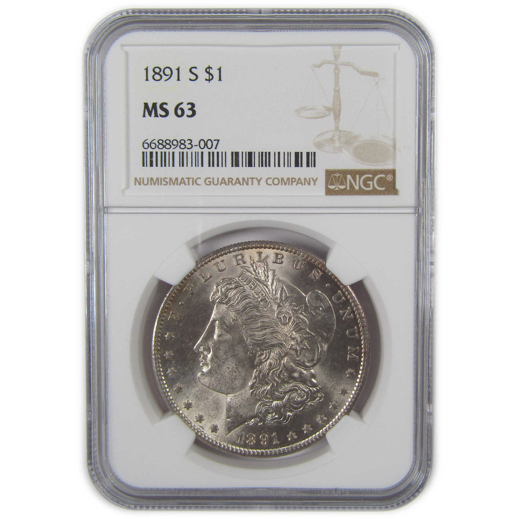 A genuine 1891 S Morgan Silver Dollar Coin, graded and certified MS 63 by NGC. Contains 90% Silver