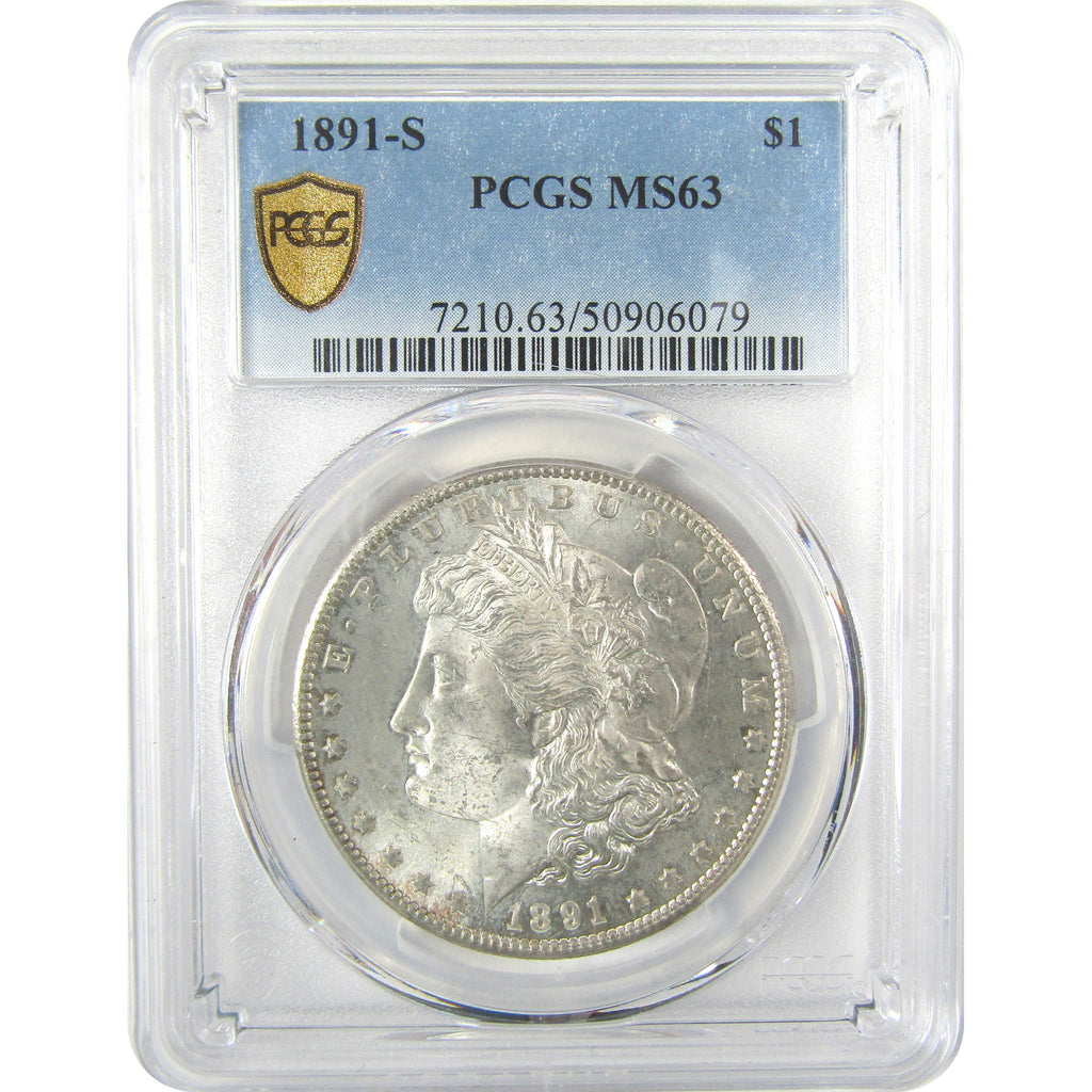 A genuine 1891 S Morgan Silver Dollar Coin, graded and certified MS 63 by PCGS. Contains 90% Silver