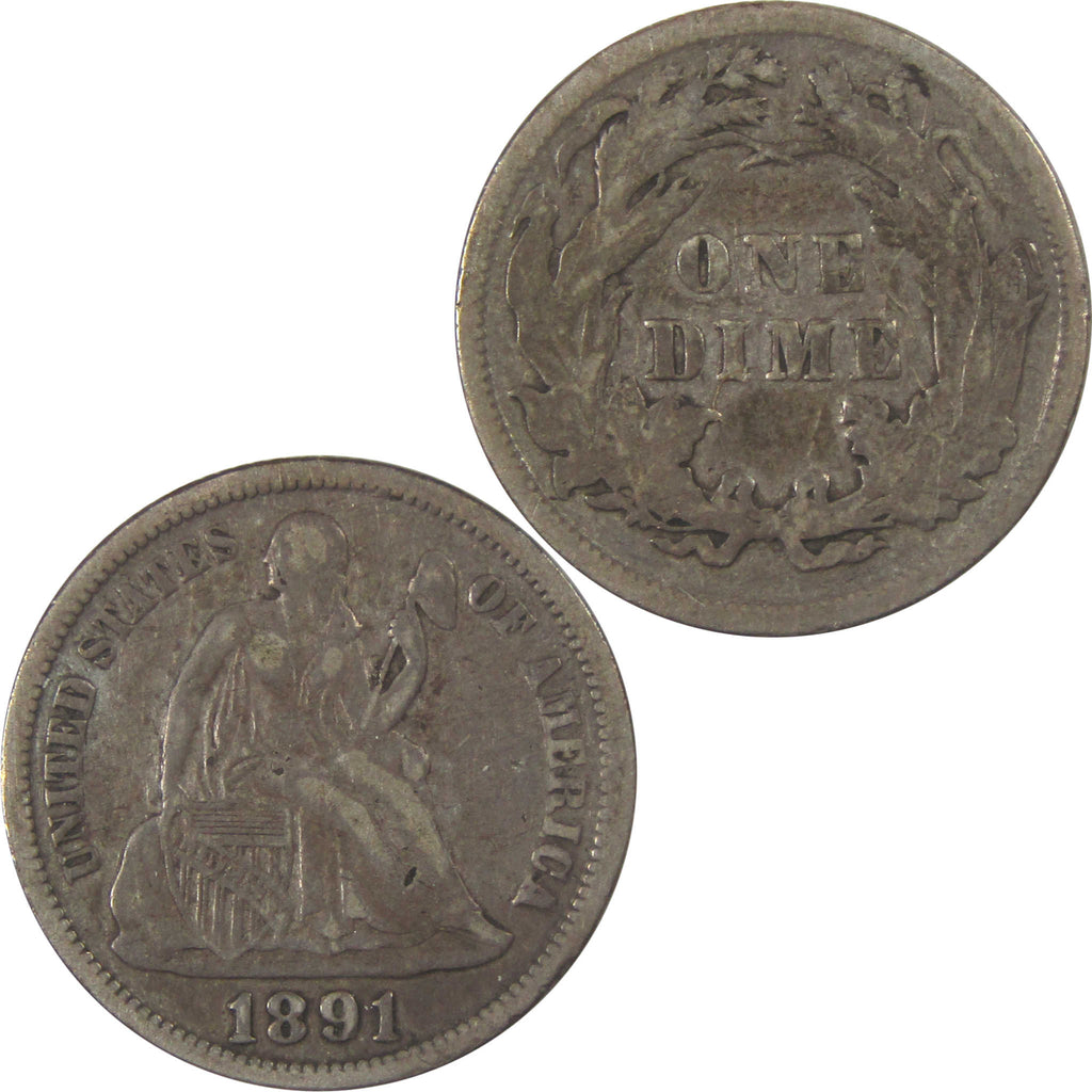 A genuine 1891 Seated Liberty Silver Dime Coin, in VF Very Fine Details Condition. Contains 90% Silver. Bent