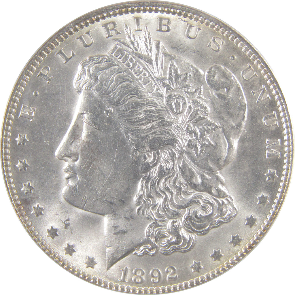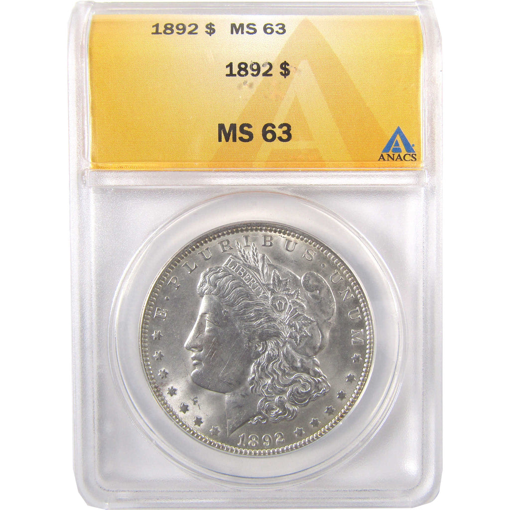 A genuine 1892 Morgan Silver Dollar Coin, graded and certified MS 63 by ANACS. Contains 90% Silver