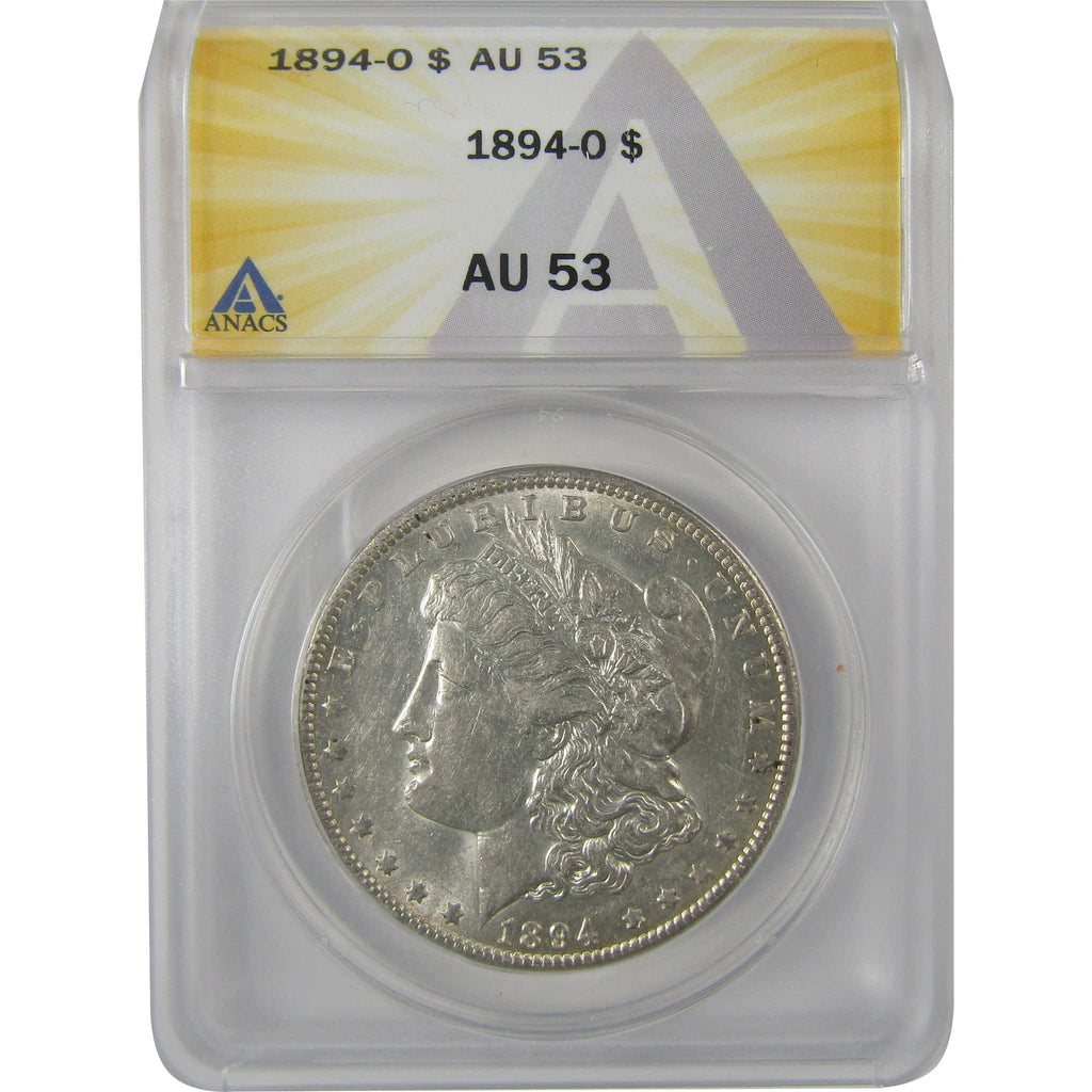 A genuine 1894 O Morgan Silver Dollar Coin, graded and certified AU 53 by ANACS. Contains 90% Silver