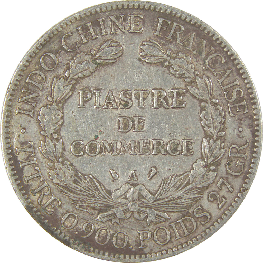 A genuine 1895-1928 Type 2 French Indochina Silver Piastre Coin, in Circulated Condition. Measures 39 mm in diameter, weighs 27 grams, and is composed of 0.9 silver. The obverse shows Marianne, the national personification of the French Republic, seated with the fasces, representing state power, justice, and unity.