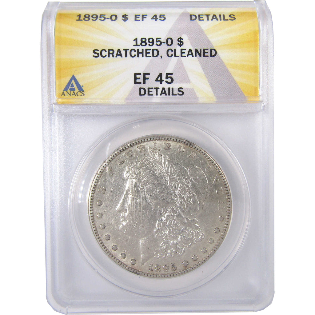 A genuine 1895 O Morgan Silver Dollar Coin, graded and certified EF 45 Details by ANACS. Contains 90% Silver. Cleaned & Scratched