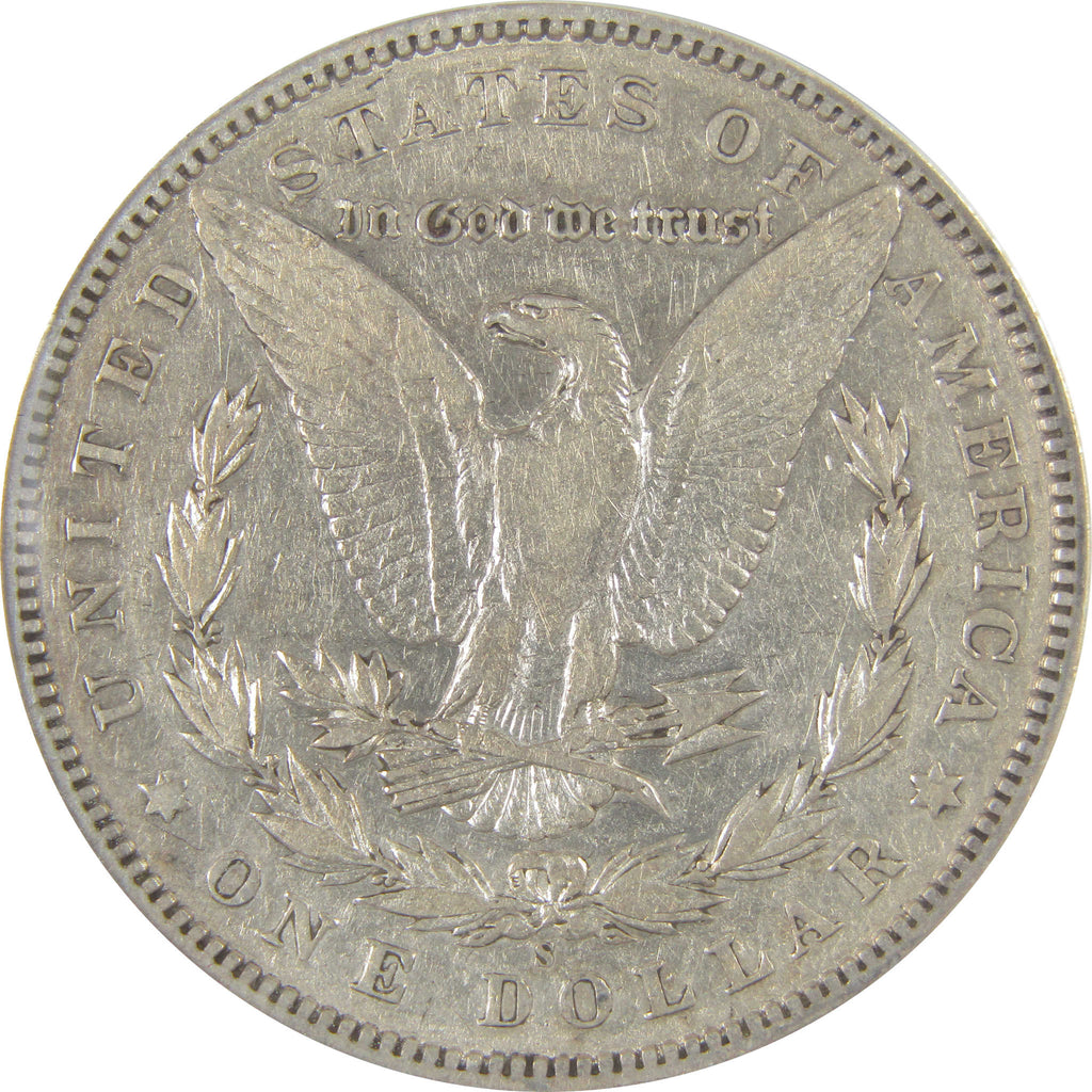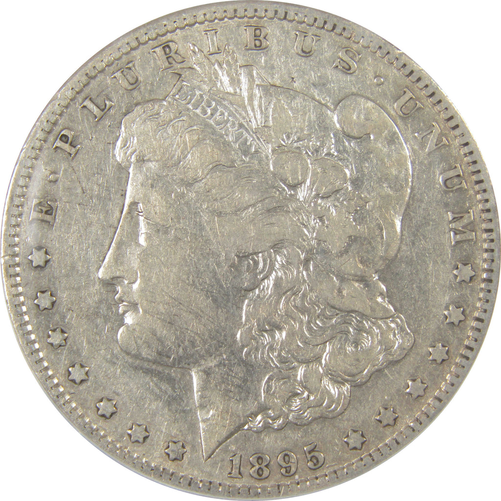 A genuine 1895 S Morgan Silver Dollar Coin, graded and certified VF 20 Details by ANACS. Contains 90% Silver. Scratched, Cleaned