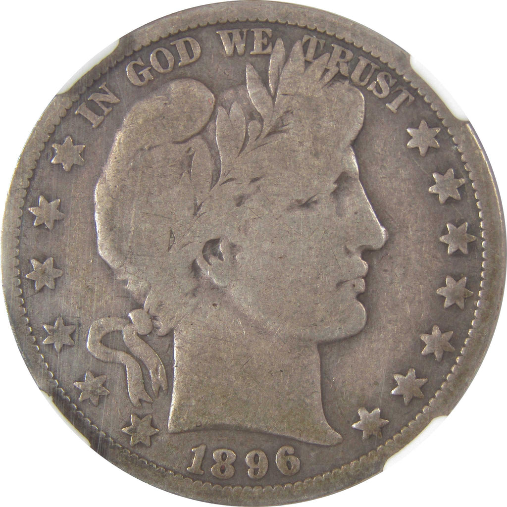 A genuine 1896 O Barber Silver Half Dollar Coin, graded and certified VG 8 by NGC. Contains 90% Silver