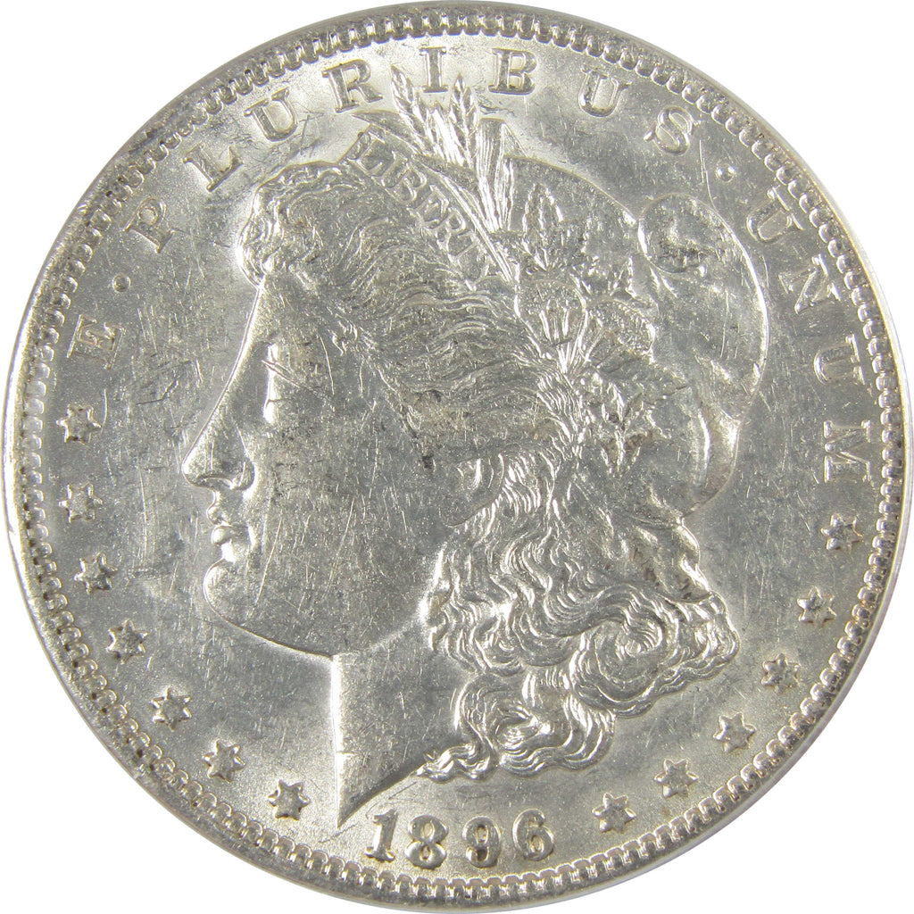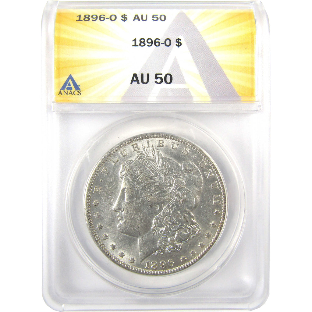 A genuine 1896 O Morgan Silver Dollar Coin, graded and certified AU 50 by ANACS. Contains 90% Silver