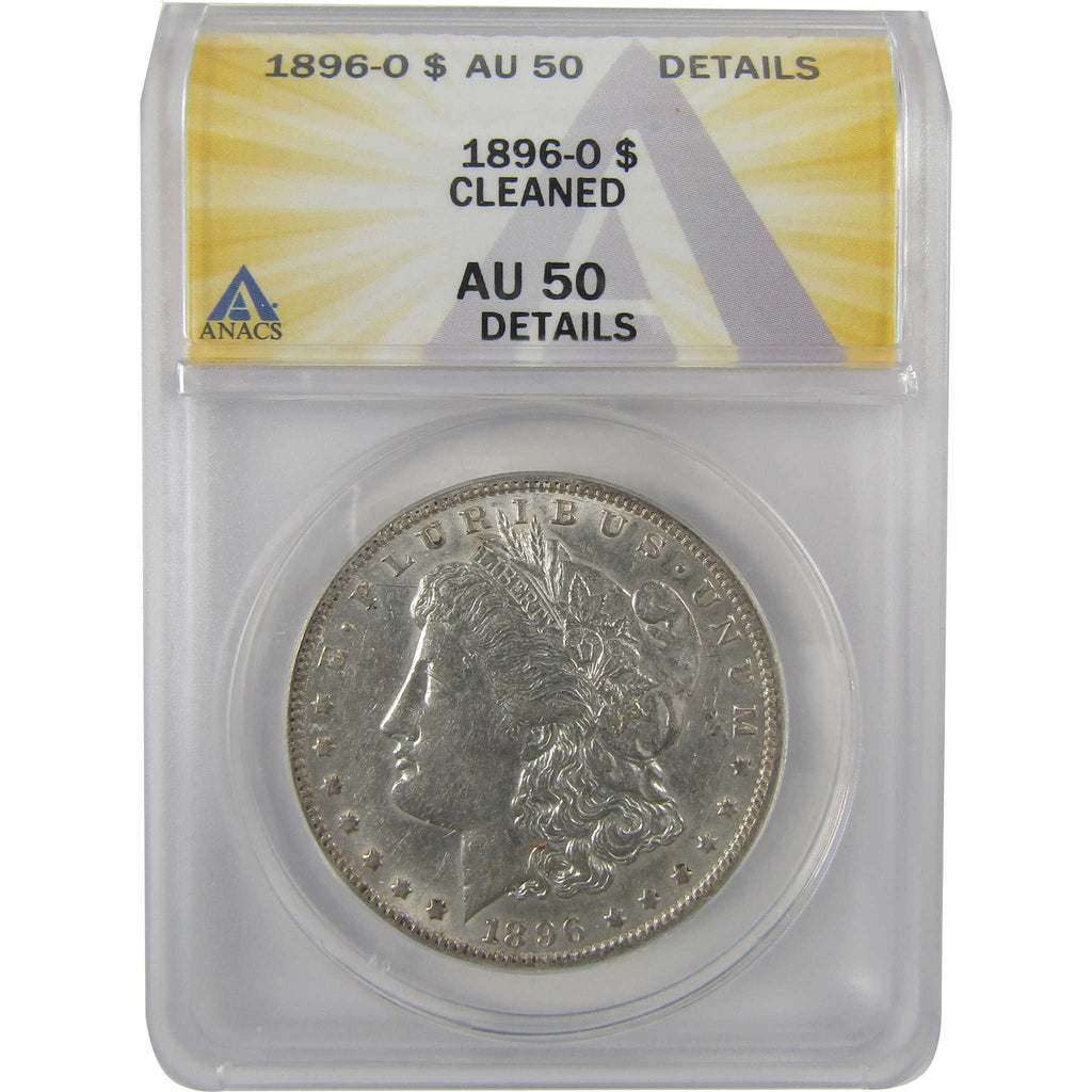 A genuine 1896 O Morgan Silver Dollar Coin, graded and certified AU 50 Details by ANACS. Contains 90% Silver. Cleaned
