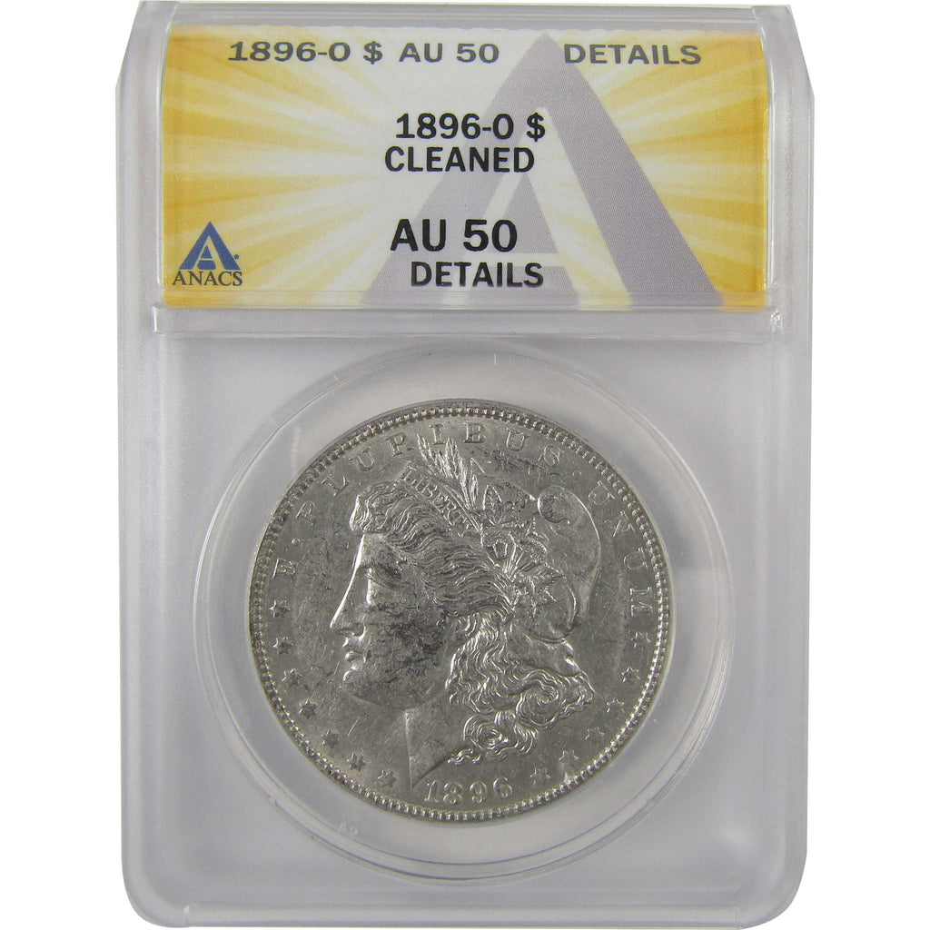 A genuine 1896 O Morgan Silver Dollar Coin, graded and certified AU 50 Details by ANACS. Contains 90% Silver. Cleaned