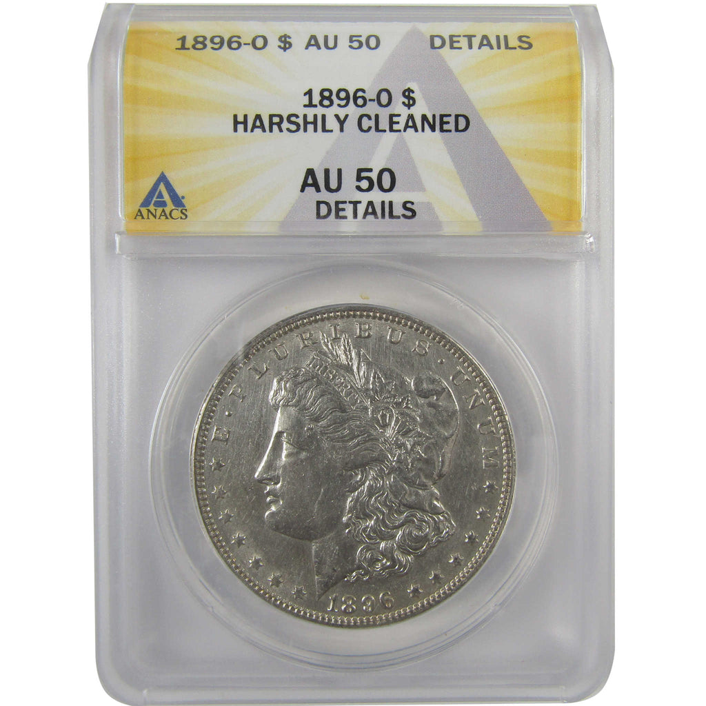 A genuine 1896 O Morgan Silver Dollar Coin, graded and certified AU 50 Details by ANACS. Contains 90% Silver. Harshly Cleaned